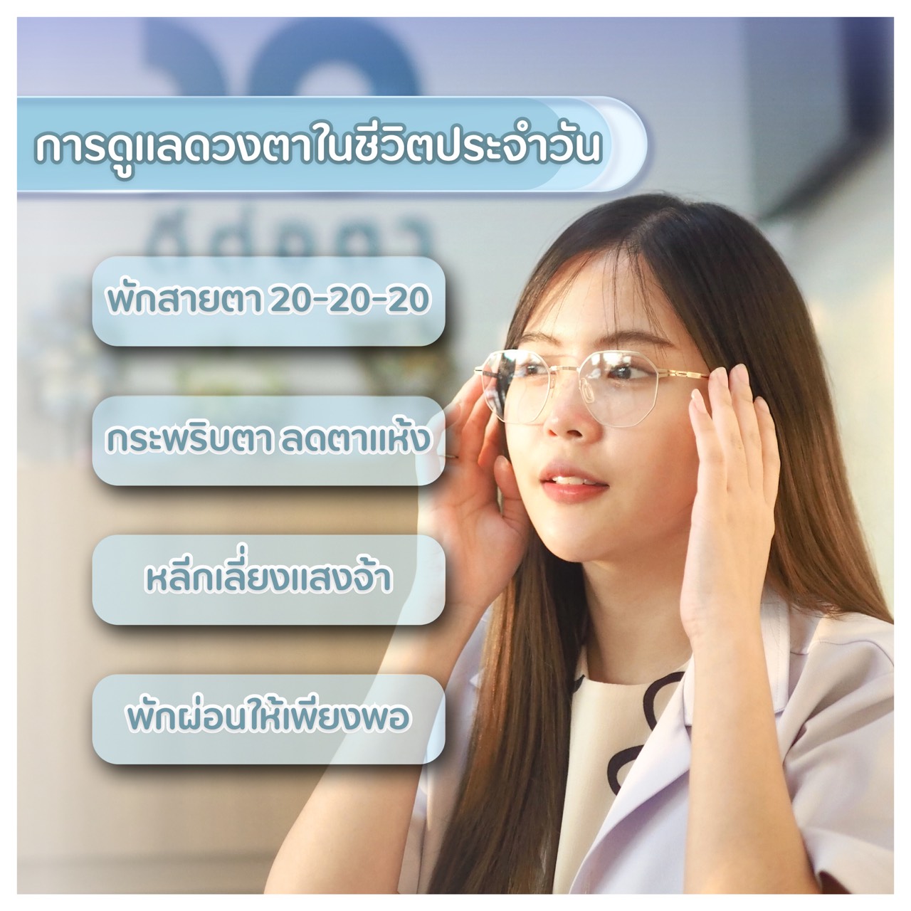 การดูแลดวงตาอย่างสม่ำเสมอช่วยลดความเสี่ยงของอาการตาล้า ตาแห้ง และความไม่สบายตาที่อาจเกิดขึ้นในระยะยาว เช่น การพักสายตาเป็นระยะ การกระพริบตาให้เพียงพอ การใช้งานสายตาในสภาพแสงที่เหมาะสม รวมถึงการพักผ่อนให้เพียงพอ